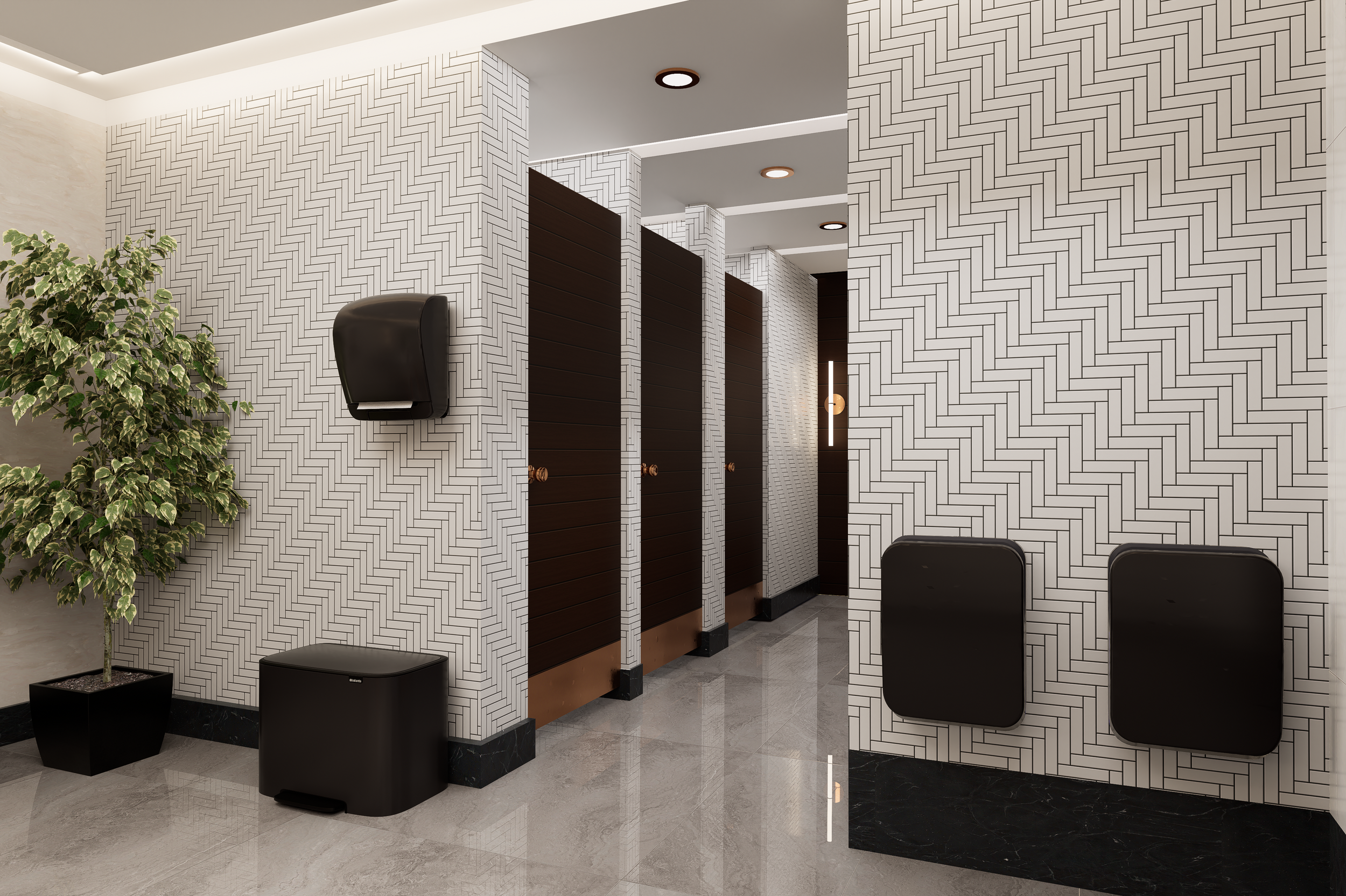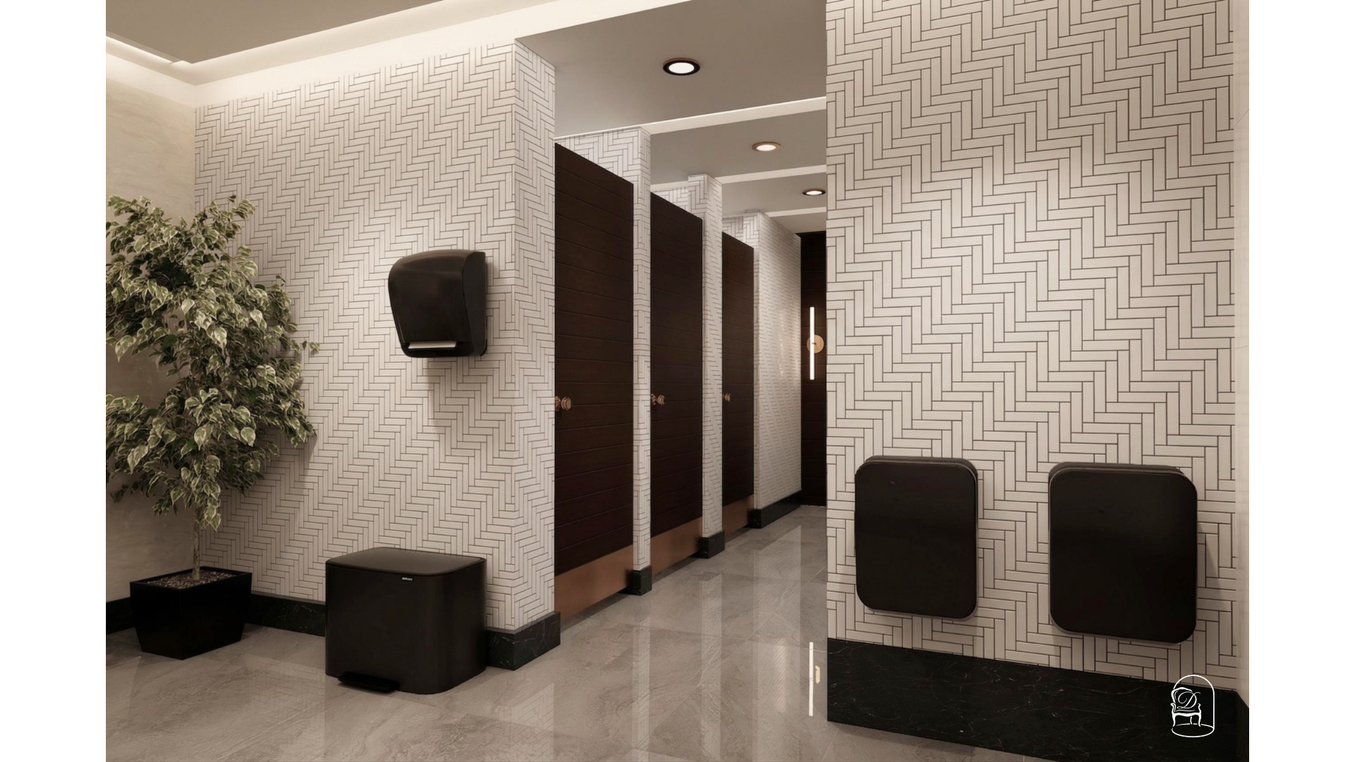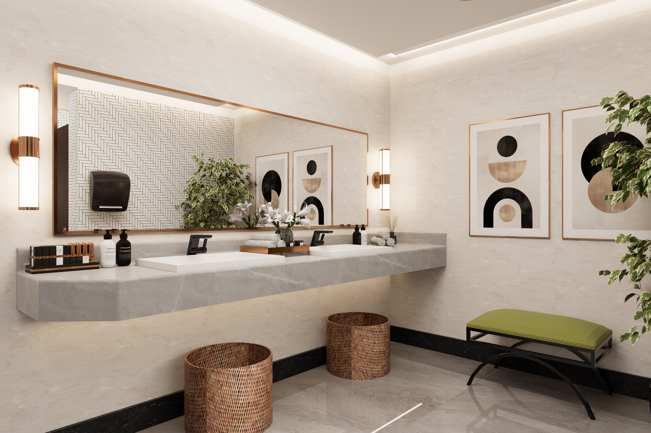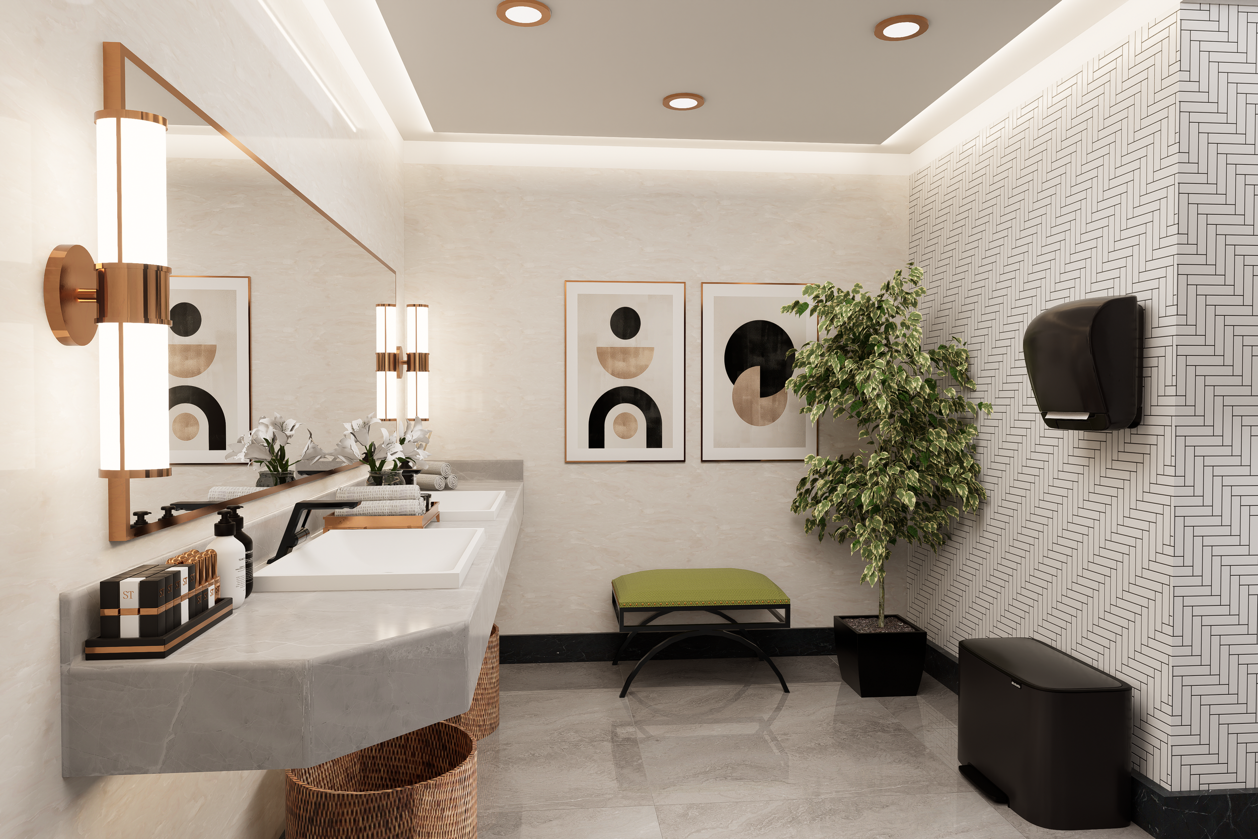 The layout focuses on clear circulation, well-defined washbasin zones and discreet cubicle separation to enhance privacy and flow. A neutral palette of stone textures and patterned wall tiles is paired with warm metallic accents and soft lighting to create a calm, contemporary atmosphere. Integrated lighting, balanced proportions and easy-to-maintain surfaces support both user experience and long-term practicality.