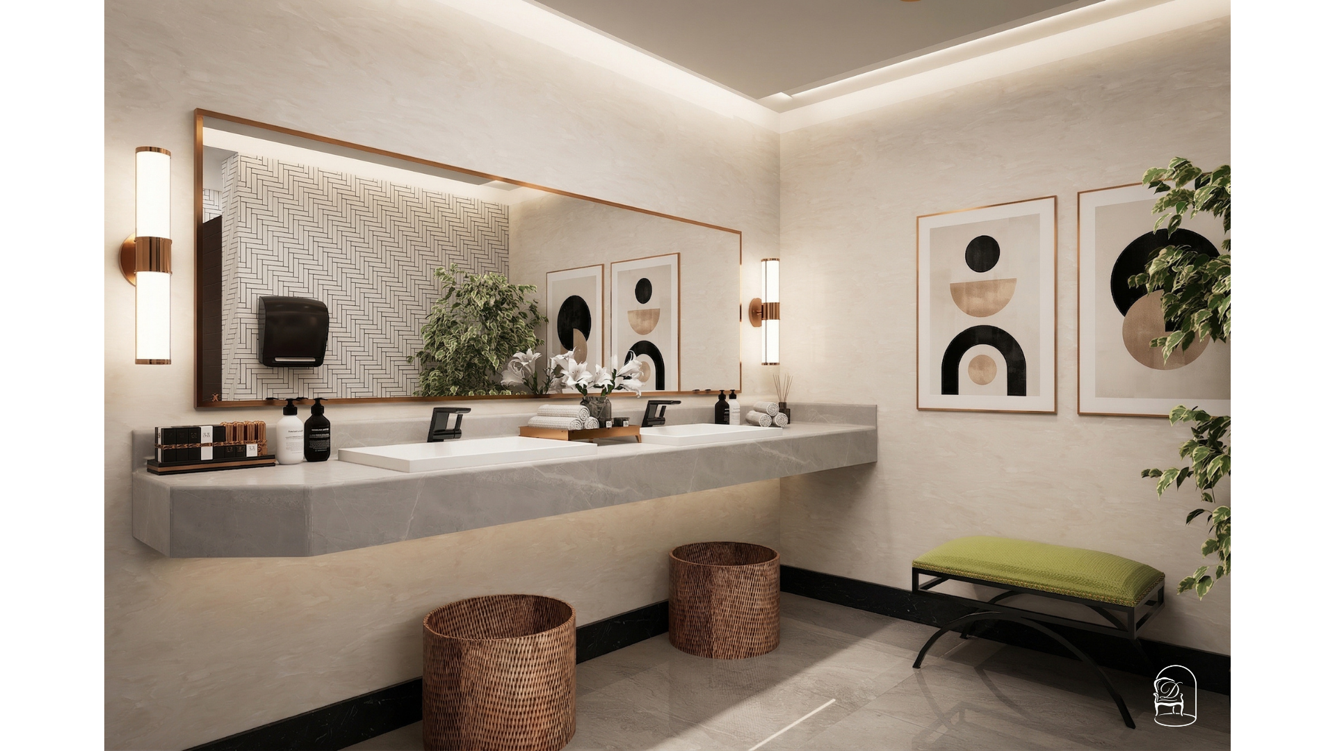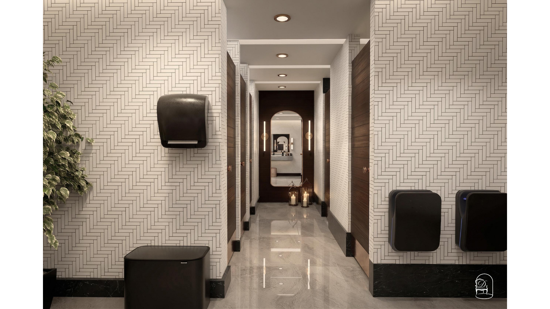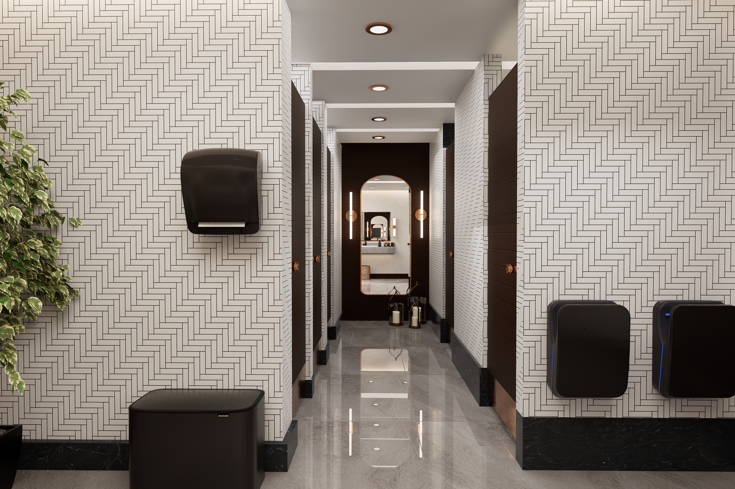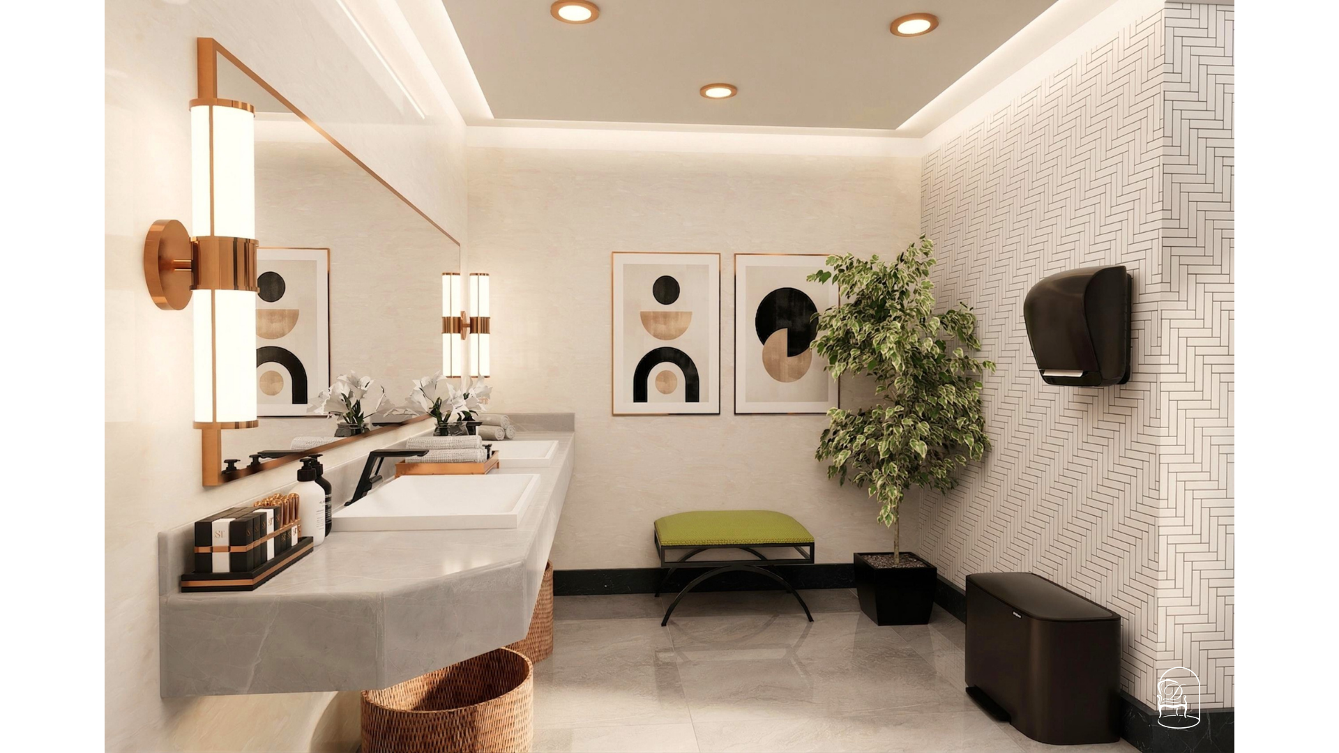 The layout focuses on clear circulation, well-defined washbasin zones and discreet cubicle separation to enhance privacy and flow. A neutral palette of stone textures and patterned wall tiles is paired with warm metallic accents and soft lighting to create a calm, contemporary atmosphere. Integrated lighting, balanced proportions and easy-to-maintain surfaces support both user experience and long-term practicality.